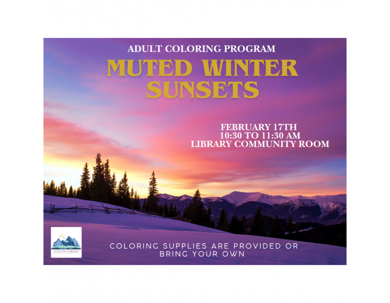 Find your calm this winter with Muted Winter Sunsets. Inviting adults to relax, color, and enjoy a cozy artistic escape.” Coloring with cozy vibes, and peaceful inspiration await. Adult Coloring Program will run from 10:30am - 11:30am. Supplies will be provided or you can bring your own.