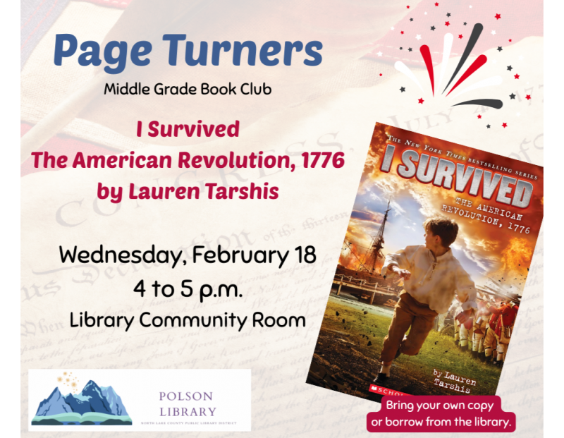 The book selection this month is "My Side of the Mountain" by Jean Craighead George. Bring a copy from home or check out the book through the partnership. We’ll have a fun book discussion, games, and snacks. Sign up at the front desk or call the Polson Library at 406-883-8225.