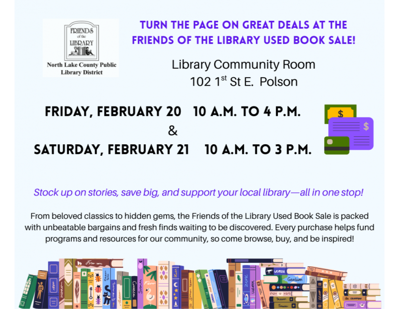 Plan to stop by the used book sale at the library in Polson and support the Friends of the North Lake County Public Library District. Proceeds from our book sales support various programs and services provided by the Polson library. Remember to bring your Friends of the Library book bag to receive discount pricing.