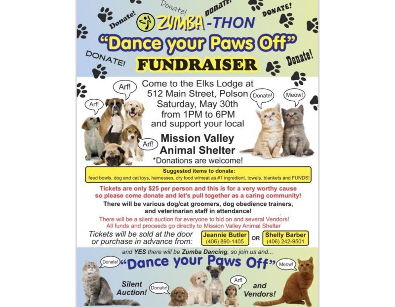 Dance your Paws Off Mission Valley Animal Shelter Fundraiser! Tickets are only $25 per person and this is for a very worthy cause so please come donate and let's pull together as a caring community! There will be various dog/cat groomers, dog obedience trainers, and veterinarian staff in attendance and lots and lots of Zumba dancing! There will be a silent auction for everyone to bid on and several vendors? All funds and proceeds go directly to Mission Valley Animal Shelter. Tickets will be sold at the door or purchase in advance from Jeannie Butler 406-890-1405 or Shelly Barber 406-242-9501.