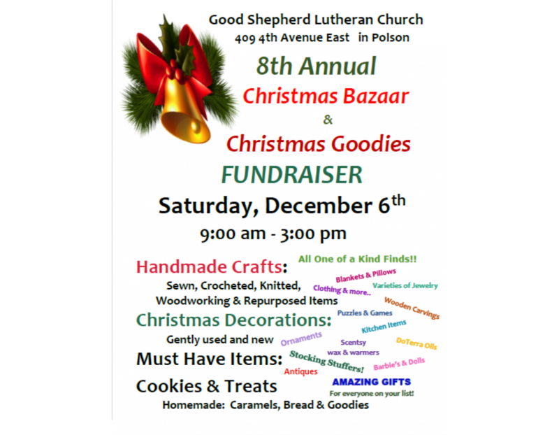 8th Annual Christmas Bazaar and Christmas Goodies Fundraiser at Good Shepherd Lutheran Church (409 4th Ave East in Polson, MT)